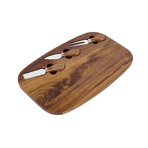 Set con 1 tabla, 2 cuchillos y 1 tenedor para quesos. Incluye caja individual. La madera es un producto natural el cual puede presentar variaciones en tonalidades y vetas.. Medidas: 35.8 x 22.6 cm . Material: Madera Acacia / Metal