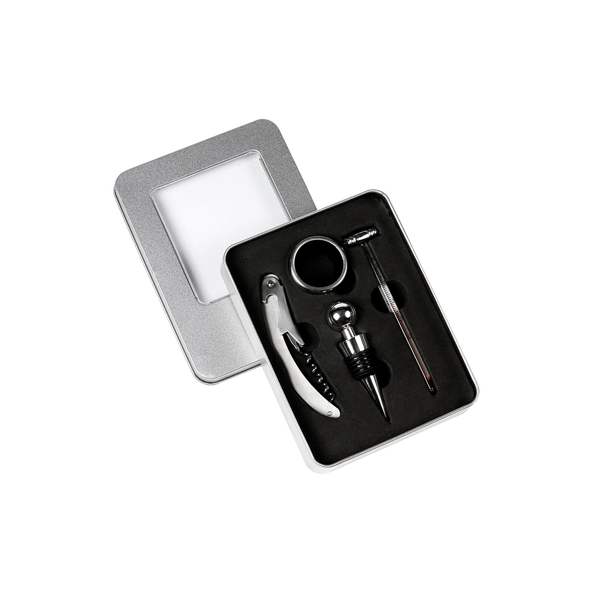 Set para vino, incluye un sacacorchos con navaja y destapador, un termómetro, un tapón corta gota y un aro antigoteo, presentado en una caja metálica con ventana transparente. Todos los accesorios están fabricados con materiales de calidad y ofrecen funcionalidad y estilo al disfrutar del vino.