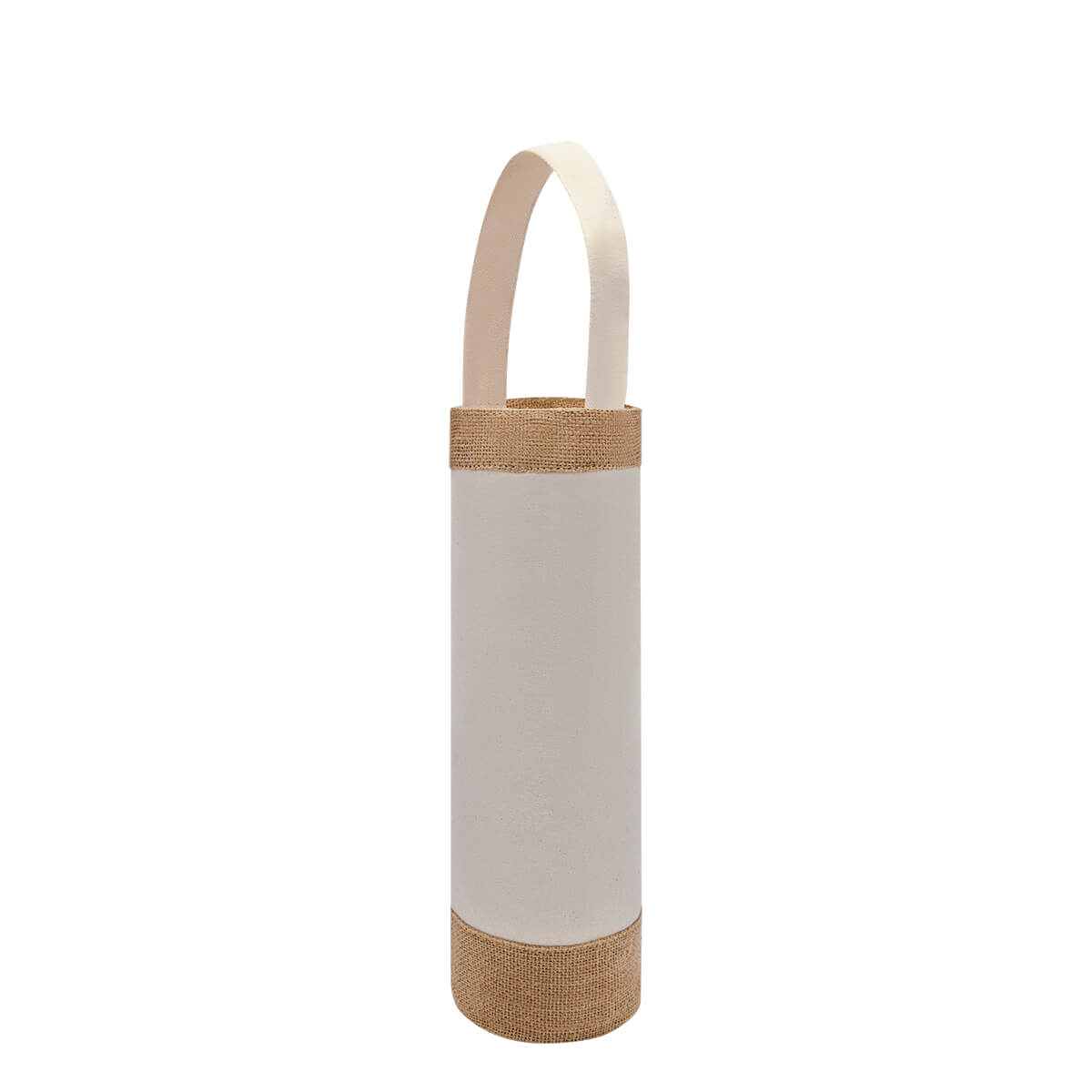 Bolsa con asa y base circular. Ideal para 1 botella de vino y llevarla contigo a cualquier lugar. El yute es un producto natural el cual puede presentar variaciones en tonalidades y en la urdimbre y trama de la tela.. Medidas: 16 x 34 cm . Material: Yute / Algodón