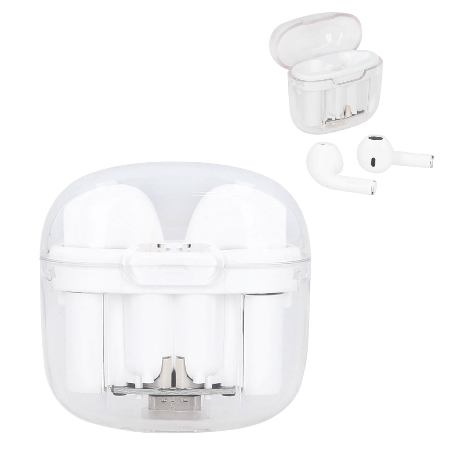 Audífonos inalámbricos con estuche transparente, batería recargable y mecanismo touch. Incluye cable de carga tipo C.. Medida producto alto: 4.7 . Medida producto ancho: 4.7 . Area impresion: 2.5 x 1 cm