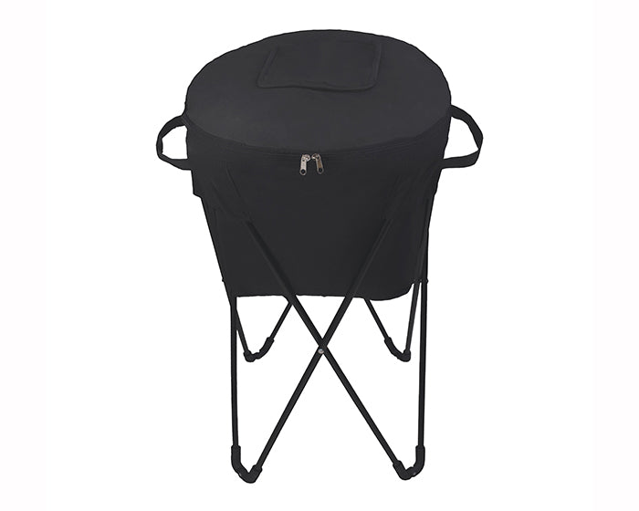 Hielera con base de metal plegable, tapa con compartimento, asas laterales y pivote para extracción de líquidos. Incluye estuche para guardar.