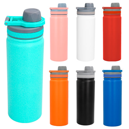 Termo de acero inoxidable de doble pared insulado al vacío con acabado rugoso. Cuenta con una tapa de rosca con asa para sujetarlo fácilmente.. Medida producto alto: 22.5 . Medida producto ancho: 7 . Area impresion: 7 x7 cm