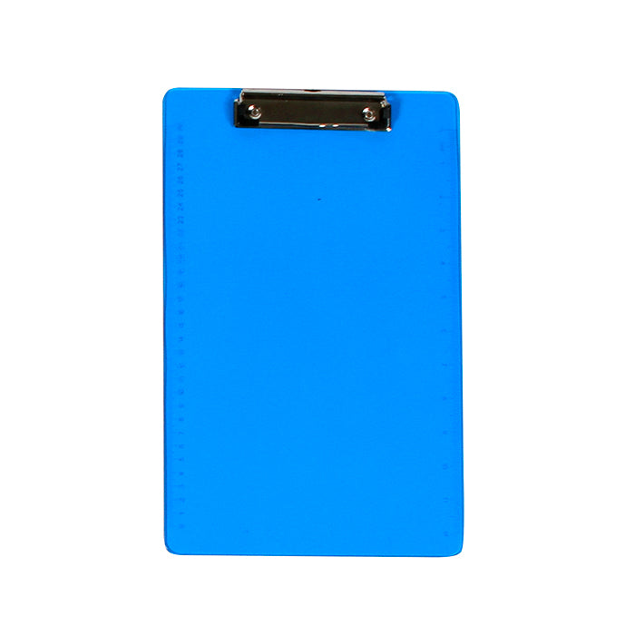 Tabla de plástico con clip metálico tipo broche para documentos y regla en las orillas. No incluye pluma. Es un accesorio esencial para mantener tus documentos organizados y protegidos.