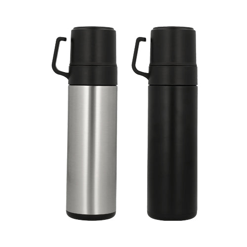 Termo de acero inoxidable de doble pared insulado al vacío, válvula de seguridad y tapa que funciona como taza. Incluye una segunda taza.. Medida producto alto: 26.5 . Medida producto ancho: 8 . Area impresion: 7 x 14 cm