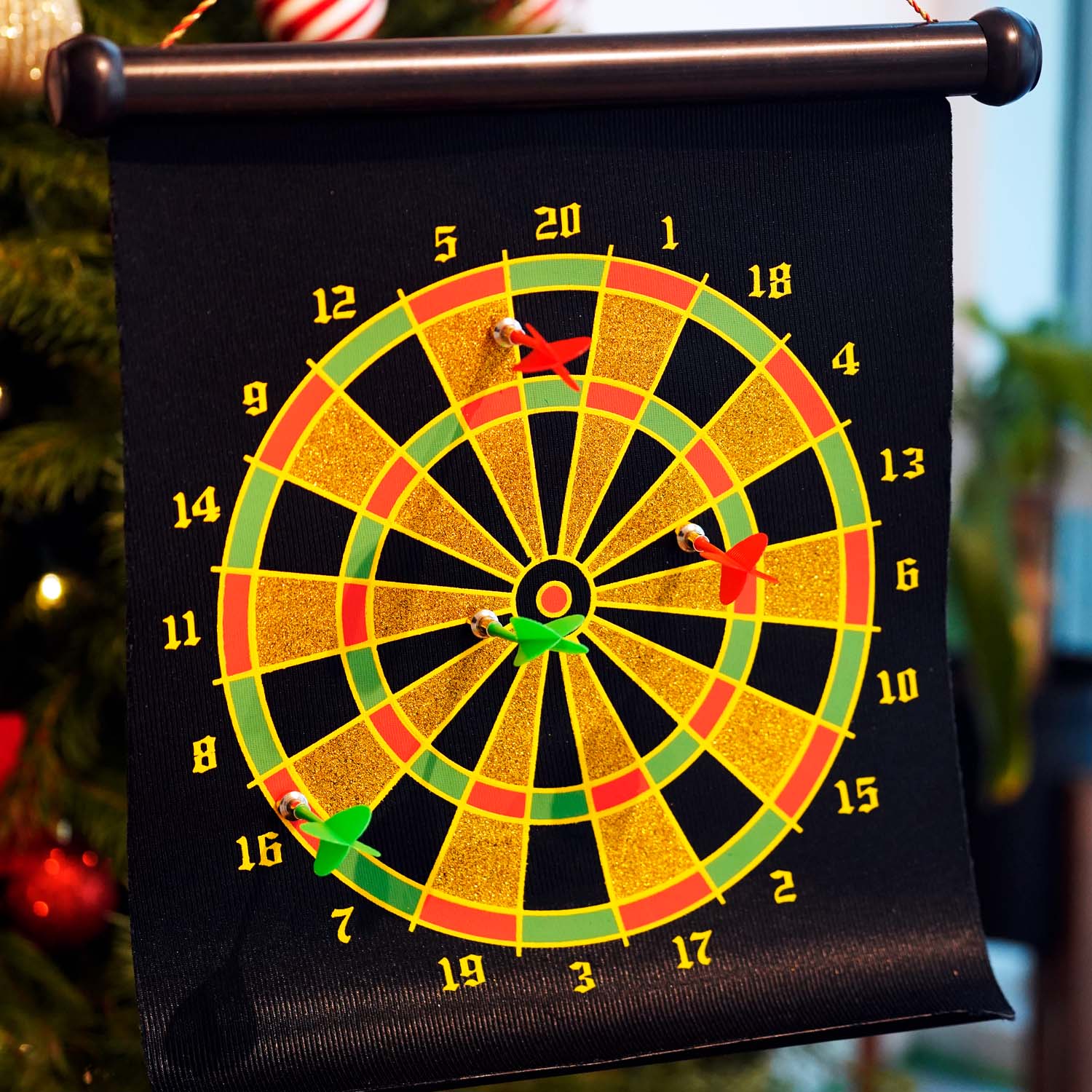 Juego de dardos magnéticos con telón de poliéster enrollable y asa para colgar. Incluye 4 dardos, tablero magnético con diversos blancos y estuche cilíndrico de cartón.. Medida producto alto: 42 . Medida producto ancho: 37 . Area impresion: 7 x 5 cm