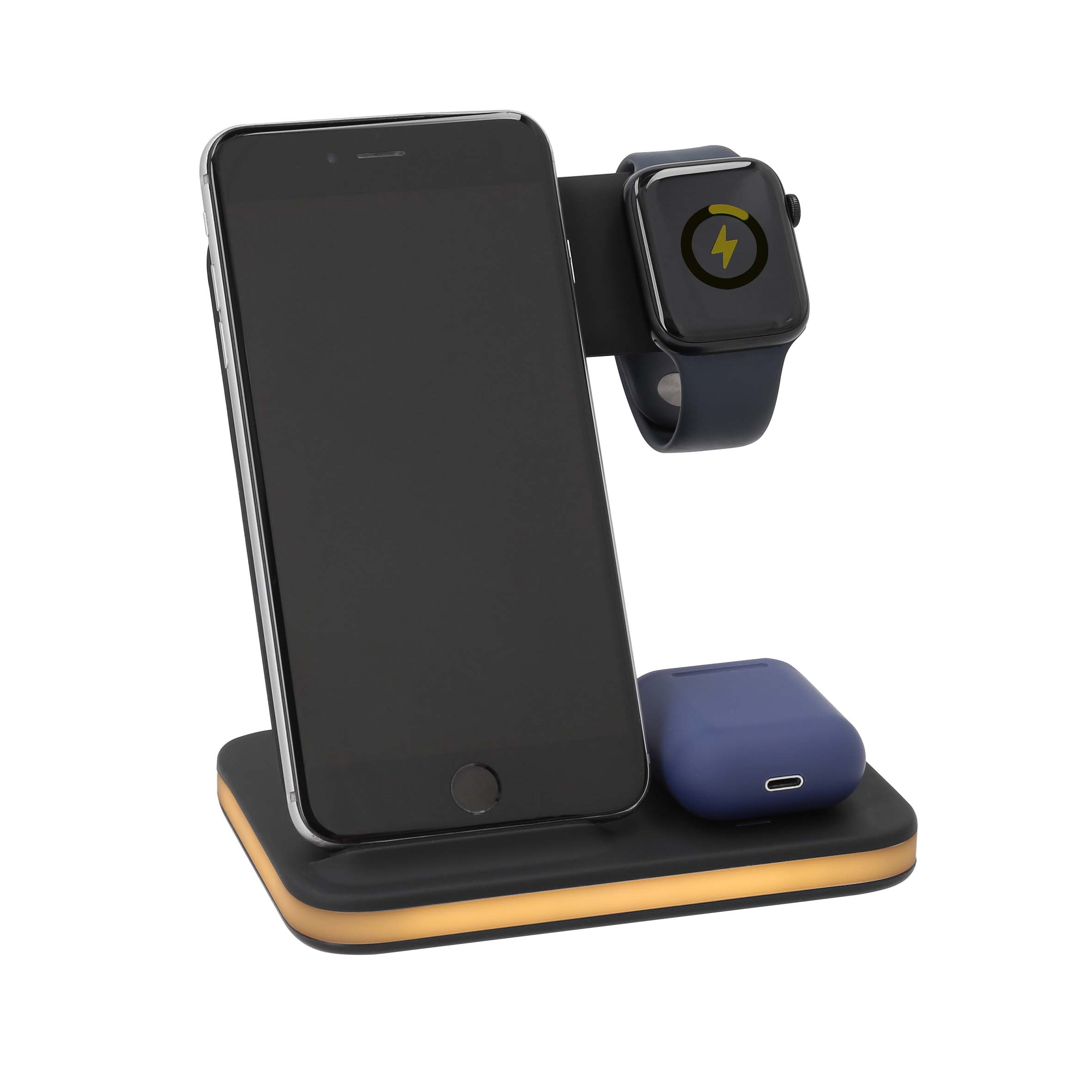 Multicargador inalámbrico para smartphone, audífonos inalámbricos, reloj inteligente y lámpara en la base, 4 en 1. Incluye cable con conector tipo C. Compatible para dispositivos con tecnología Qi.. Medida producto alto: 14 . Medida producto ancho: 13.2 . Area impresion: 4 x 3 cm