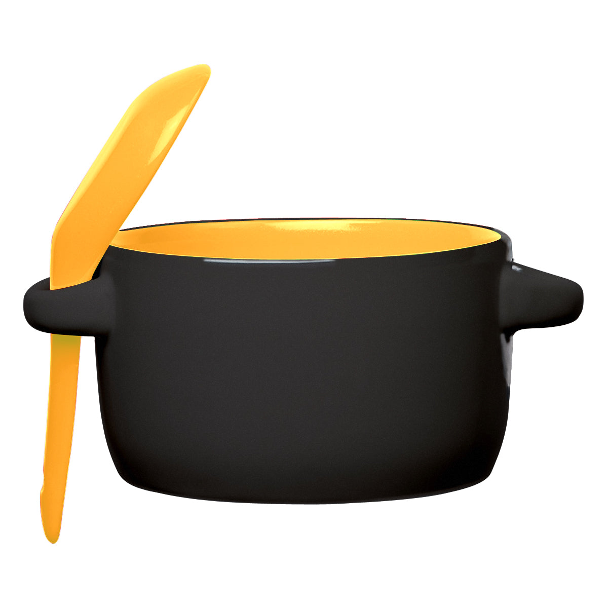 Taza para sopa con cuchara fabricada de cerámica con capacidad de 12 Oz. Cuchara para sopa a juego extraíble. Cumple con los requisitos de la FDA. Se recomienda lavar a mano. No recomendado para uso comercial.