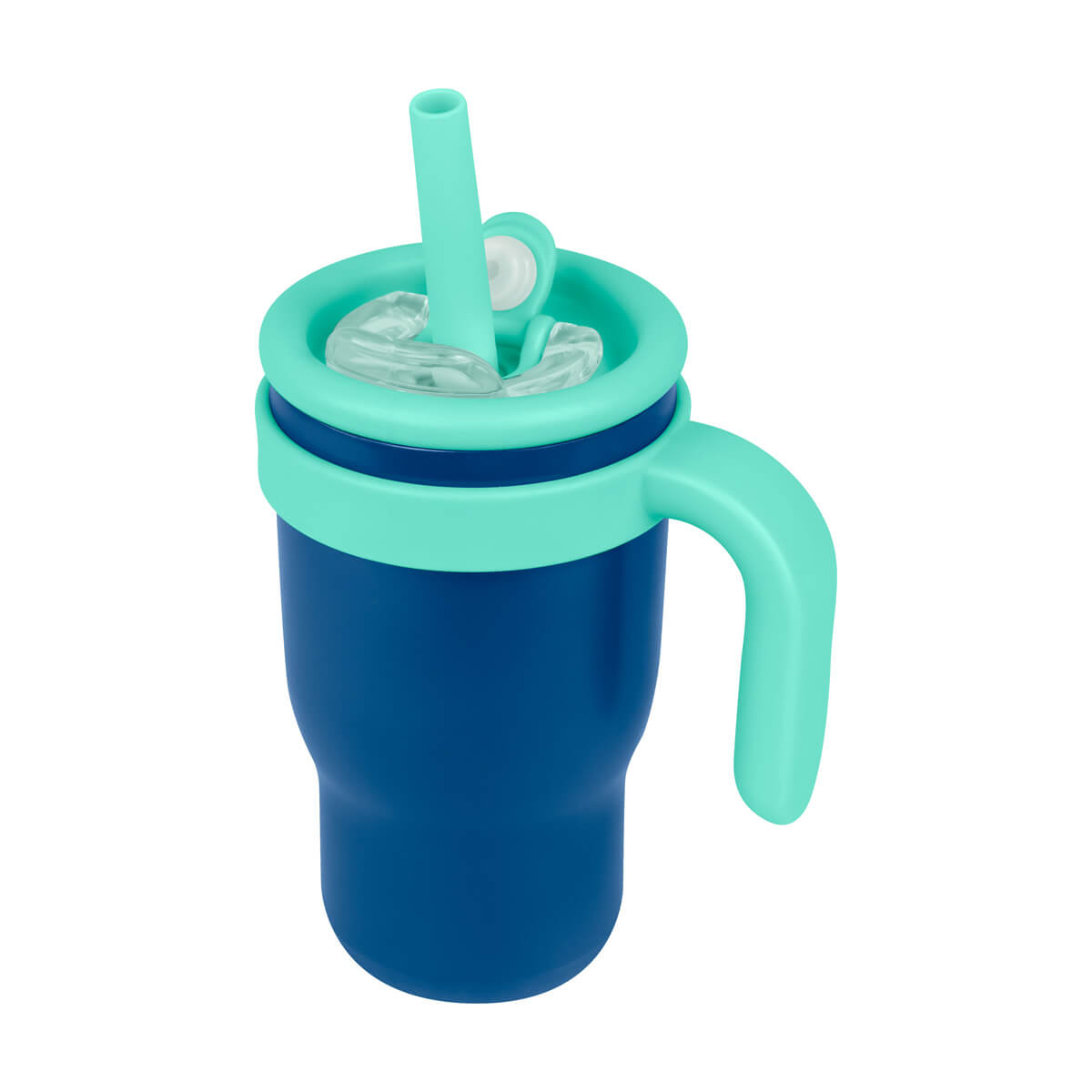 Termo doble pared. Cerrado al vacío. Pared interna y externa de acero inoxidable. Tapa de plástico con cierre de rosca que le aporta mayor seguridad. Cuenta con dos funcionalidades en la tapa, boquilla para beber con sobre tapa push y ranura para popote con sobre tapa adicional. Popote con boquilla de silicón, avanzado sistema de cierre anti derrames y asa de plástico. Su práctico tamaño, te permitirá transportarlo fácilmente a cualquier lugar. Ideal para niños y adultos. Mantiene temperatura caliente 6 hrs y fría 8 hrs. Capacidad de 15 Oz. Base de 6.5 cm de diámetro. Incluye cuerpo con terminado rugoso y caja individual.. Medidas: 12 x 15.8 x 9 cm . Material: Acero inoxidable / Plástico / Silicón