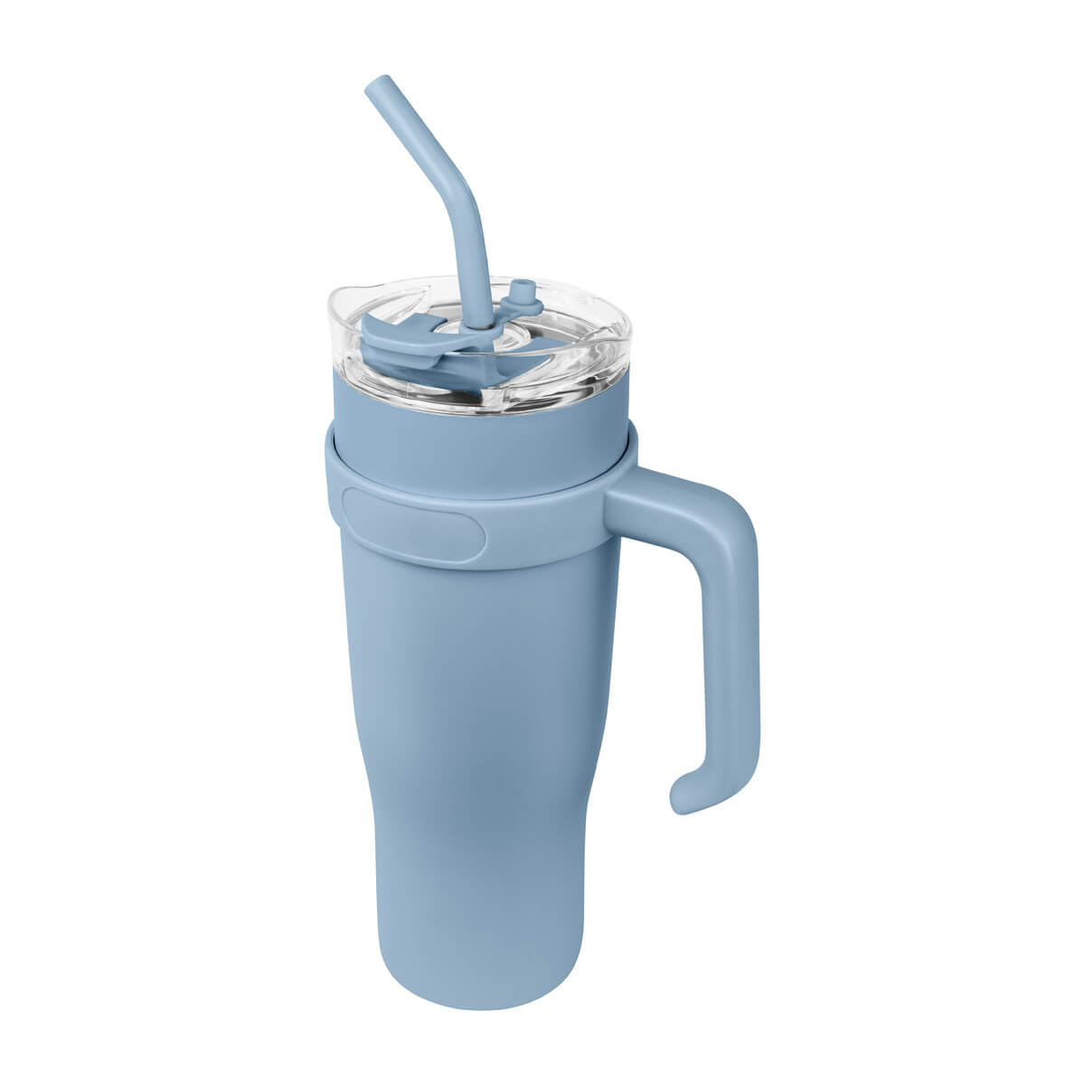 Termo doble pared. Cerrado al vacío. Pared interna y externa acero inoxidable. Cuerpo con terminado rugoso. Tapa de plástico y sobretapa con sistema push, incluye una ranura para popote con tapón de silicón. Su cuerpo de amplia capacidad lo hace perfecto para compartir o disfrutar de varias tazas de tu bebida favorita, además su asa ergonómica permite un transporte fácil y cómodo. Mantiene la temperatura caliente por 12 hrs y la temperatura fría por 20 hrs. Capacidad de 40 Oz. Base de 8.2 cm de diámetro. Incluye popote metálico con boquilla de silicón y caja individual.. Medidas: 16.5 x 27.2 x 10.3 cm . Material: Acero inoxidable / Plástico