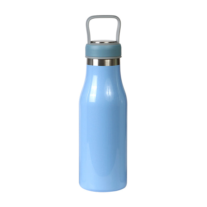 Termo de acero inoxidable doble pared con asa de plástico y detalles metálicos, fabricado en materiales de grado alimenticio, mantiene bebidas frías o calientes por un largo tiempo, no usar en microondas. Capacidad de 510 ml 17 oz. Incluye caja de cartón individual.
