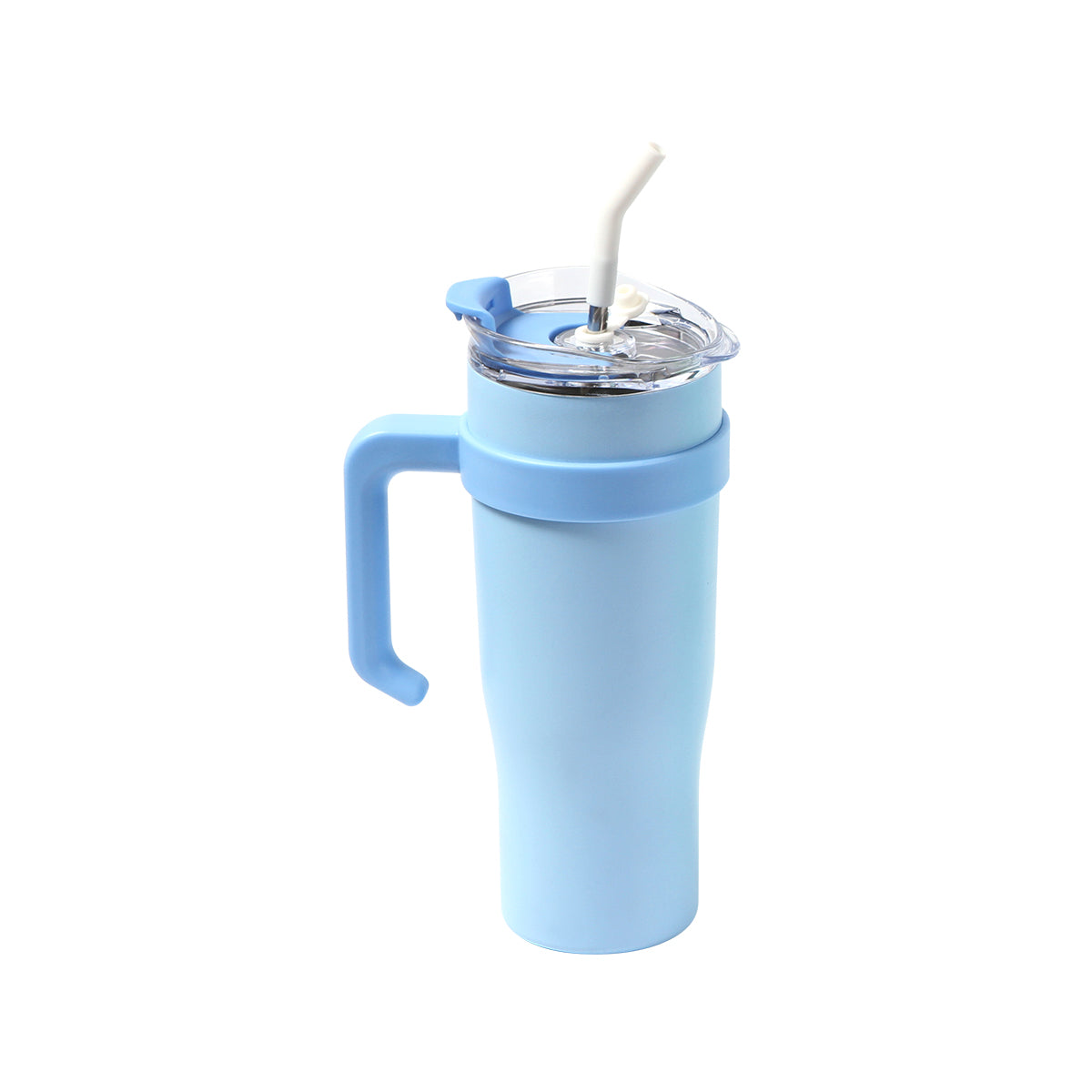 Termo doble pared fabricado en acero inoxidable SS304 y SS201, incluye popote de acero inoxidable con boquilla removible de silicón, agarradera, tapa transparente con entrada hermética para popote y compartimento para boquilla con capacidad de 1,200 ml. Incluye caja de cartón individual.