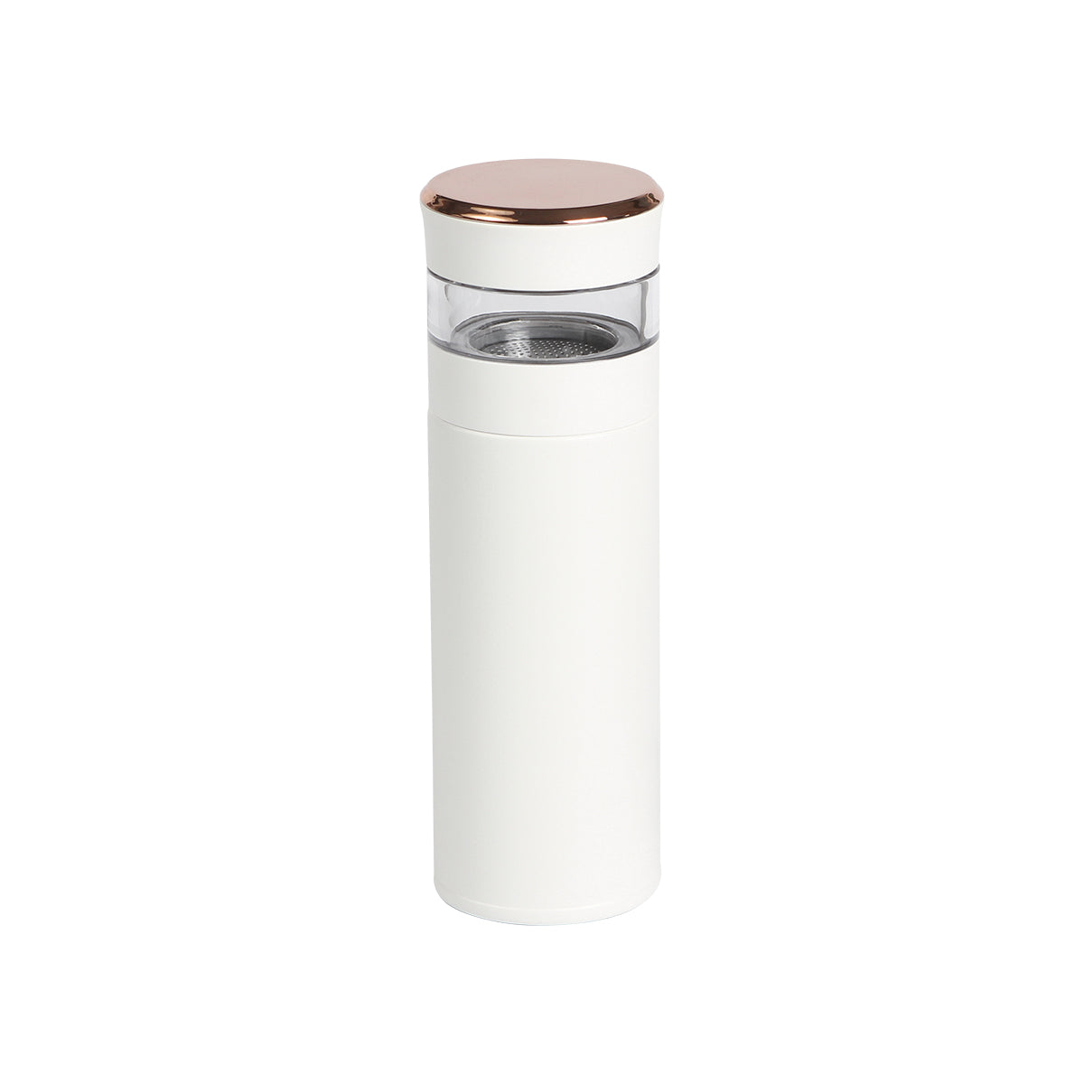 Termo de acero inoxidable doble pared con display de temperatura en la tapa, sección para infusiones con rejilla coladora, fabricada en materiales de grado alimenticio, mantiene bebidas frías o calientes por un largo tiempo. No usar en microondas. Capacidad de 400 ml. Incluye caja de cartón individual.