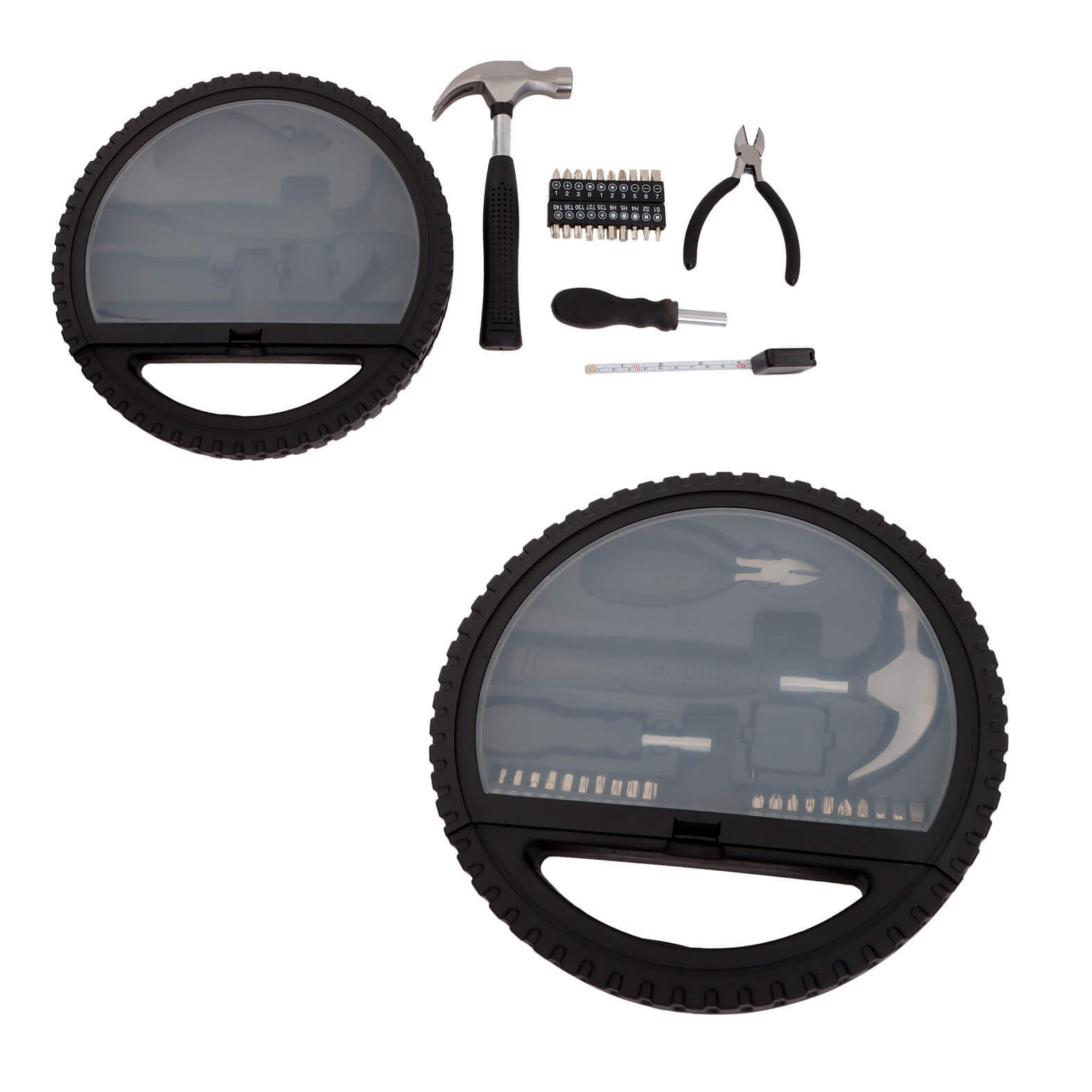 Set de herramientas en forma de llanta que incluye: 1 martillo, 1 pinza, 1 flexómetro, 1 destornillador y 2 juegos de 10 puntas.. Medida producto alto: 26 . Medida producto ancho: 26 . Area impresion: 13 x 8 cm