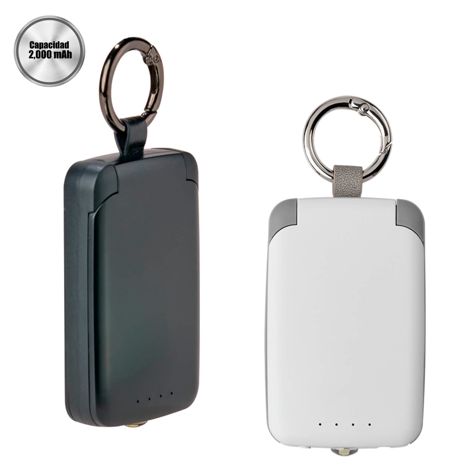 Power Bank de 2,000 mAh con un cable Tipo C y un cable Lightning, luz de dos niveles, indicador de carga y aro metálico con gancho para mayor sujeción. Incluye cable de carga tipo C.. Medida producto alto: 7 . Medida producto ancho: 4.5 . Area impresion: 3 x 3 cm