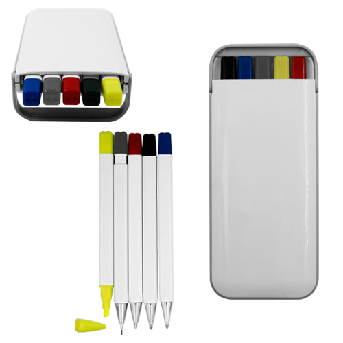Set de escritura de plástico con asa que sirve como base que contiene: 3 bolígrafos de color negro, rojo y azul, 1 lapicero y 1 marcatextos verde.. Medida producto alto: 13 . Medida producto ancho: 5.5 . Area impresion: 4 x 10 cm