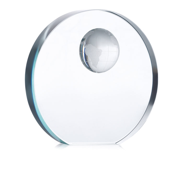 Elegante trofeo redondo fabricado de cristal, con dibujo de medio globo en relieve en la parte superior. Presentado en una clásica caja de regalo.