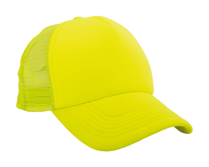 Gorra en poliéster con cuerpo y visera del mismo color. Con amplio frente acolchado y 4 gajos en malla en color fosforescente. Ajuste con broche de plástico.