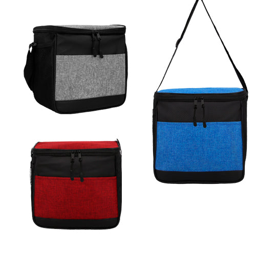 Lonchera con interior impermeable, correa ajustable, dos bolsas de malla laterales, compartimento externo al frente de curpiel. Medida producto alto: 24 . Medida producto ancho: 24 . Area impresion: 15 x 8 cm