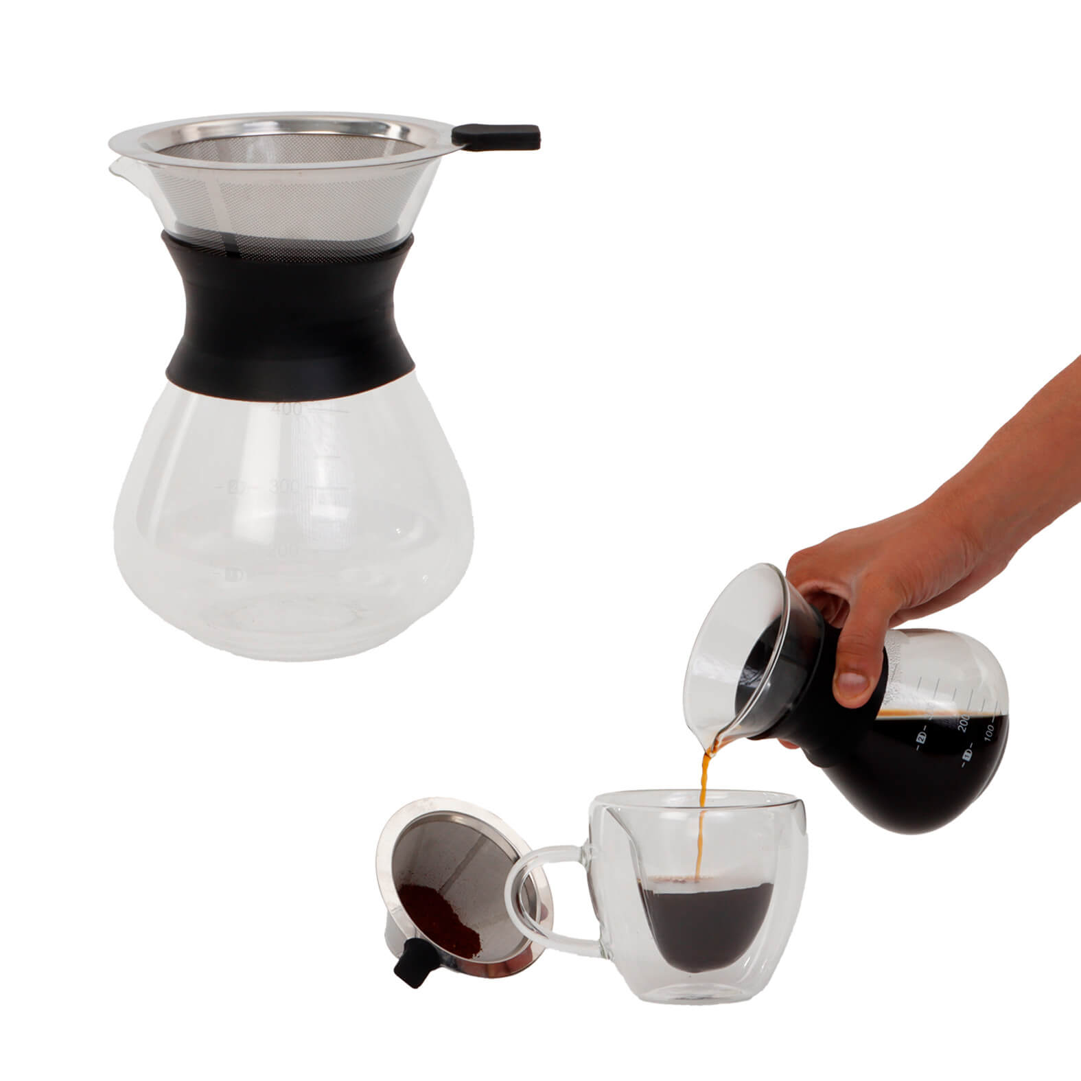 Cafetera de goteo con medición, cuenta con filtro de cono de acero inoxidable y collar de silicón. No incluye taza.. Medida producto alto: 9 . Medida producto ancho: 14.3 . Area impresion: 6 x 5 cm