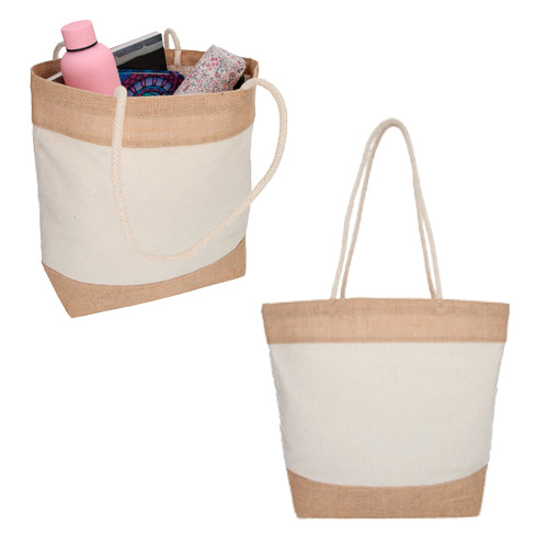 Bolsa de yute y algodón cosida con asas.. Medida producto alto: 35 . Medida producto ancho: 44.5 . Area impresion: 27 x 16 cm